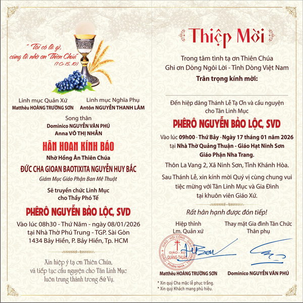 Con Tina được sự gửi gắm của Cha Linh Hướng F1 trân trọng báo tin và mời tất cả quý Cha, quý Soeurs, quý anh chị em thế hệ F1, thuộc gia đình CCS Huế trong nước và hải ngoại, hiệp thông cầu nguyện và tham dự Thánh lễ Truyền chức Tân Linh mục PHÊRÔ NGUYỄN BẢO LỘC - F1/HT67 vào ngày 08/01/2026, nhà thờ Phú Trung - Sài Gòn, và Lễ Tạ Ơn ngày 17/01/2026 tại Giáo xứ Quảng Thuận, Ninh Thuận.