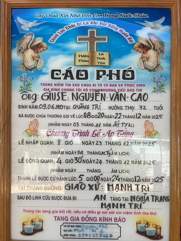 Anh Giuse Nguyễn Văn Cao, Cựu Chủng sinh Huế lớp HT63-64, đã được Chúa gọi về lúc 08g20 sáng ngày 22/12/2025 tại Giáo xứ Hạnh Trí, Giáo phận Nha Trang, hưởng thọ 72 tuổi.