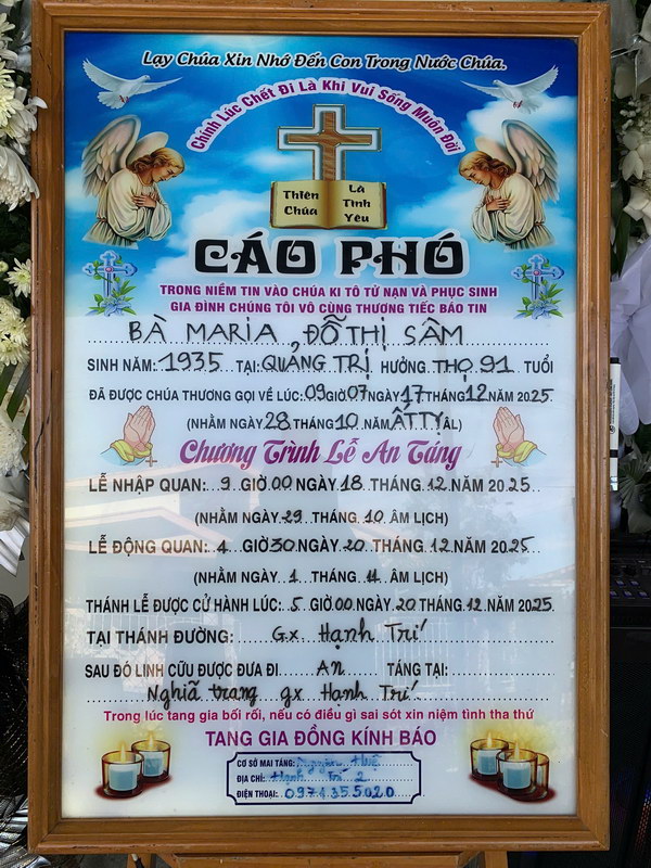 đã được Chúa gọi về lúc 09g7’ ngày 17/12/2025 tại giáo xứ Hạnh Trí, giáo phận Nha Trang, hưởng thọ 91 tuổi.