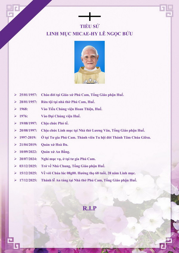 Linh mục Micae-Hy Lê Ngọc Bửu, lớp Hoan Thiện 68, đã được Chúa gọi về lúc 08g00 thứ Hai 15/12/2025 tại Nhà Chung, TGP Huế, hưởng thọ 68 tuổi, 28 năm linh mục.