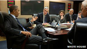 cùng các cố vấn an ninh ngồi trong phòng, nơi ông được báo cáo
