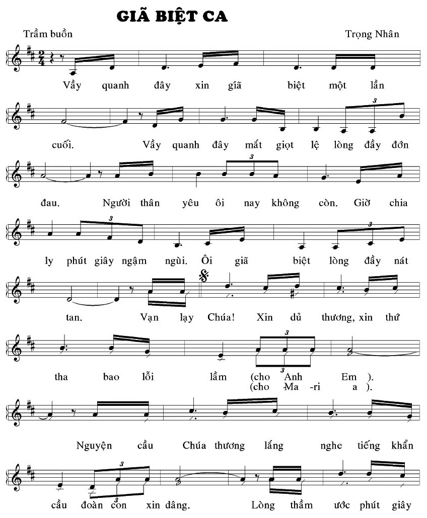 | Quý Anh Em thân mến, Dịp gặp gỡ anh em bên cạnh Cha Bênêđictô lần cuối như thế nầy, thật là xúc động. Trọng Nhân (HT65) không thể nào cầm nỗi xúc động khi nhìn thấy hình ảnh và đoạn Video Clip về Cha Bênêđictô, người anh em thân yêu cùng lớp HT65. Trọng Nhân rất xót xa về sự ra đi vĩnh viễn qúa sớm của Cha Bênêđictô. Trọng Nhân cũng rất thổn thức vì mình không hiện diện bên cạnh người Anh Em lần cuối, để cùng với Anh Em tiễn biệt Cha Bênêđictô thân yêu. Trọng Nhân đã trải qua một cuộc giải phẩu chí tử tại Huế do việc tắt nghẽn động mạch vành và đã giải phẩu nối chủ-vành được bình an. Vì lý do sức khỏe, Trọng Nhân không hiện diện được bên cạnh người Anh Em lần cuối. Trọng Nhân xin gởi bản GIÃ BIỆT CA như một thổn thức góp lời giã biệt người Anh Em trong biến cố tang thương và xúc động nầy. Khi nào Anh Em đi ngang Lăng Cô Huế, xin kính mời Anh Em dừng bước hàn huyên tại Giáo Xứ SÁO CÁT, bên bờ Thái Bình Dương. Thân ái Trọng Nhân (Trần Khôi HT65) |