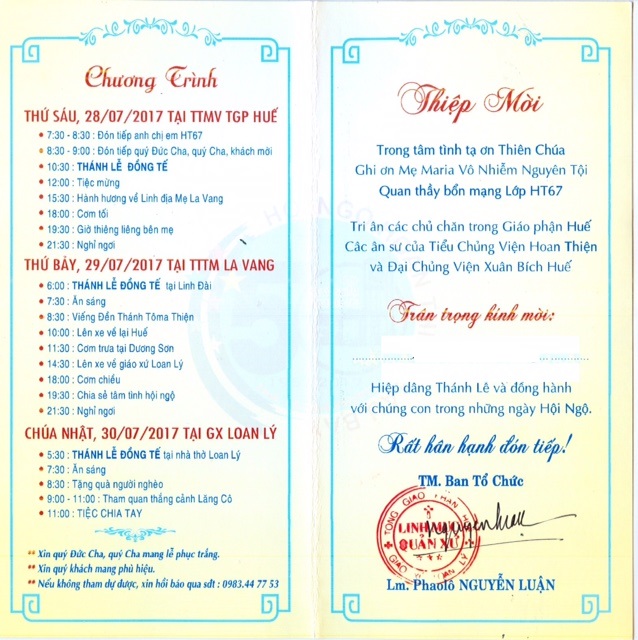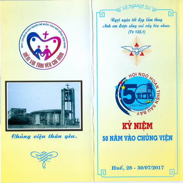 Trong tâm tình tạ ơn Thiên Chúa, ghi ơn Mẹ Maria Vô Nhiễm Nguyên Tội, Quan Thầy bổn mạng lớp, tri ân các ân sư, lớp Hoan Thiện 1967 sẽ tổ chức Hội Ngộ kỷ niệm 50 năm nhập chủng viện vào 3 ngày 28-30/7/2017 tại TGP Huế.