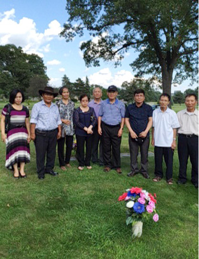 Con Oanh, Liệu, C. Đề, C. Oanh, Đề, ĐÔ Hàm, Ủy, Thuần, Thông Bia đặt nằm sát nền cỏ, đầu một có một bình hoa bằng kim loại. Bình hoa này, mùa đông sẽ bị đặt ngược vào một lỗ hỗng có sẵn để trốn tuyết, cho đến mùa xuân năm sau gia đình đến tùy ý dựng lên để làm bình hoa. Nói đến hoa giả không tàn, tôi nhớ đến một chuyện đùa. Tại một Dòng Nữ, có mấy tu sinh sắp được khấn lần đầu. Một Nữ Tu sinh đến xin Bề trên cho phép về nhà vài ngày vì cha mẹ nhắn vào có chuyện khẩn cấp xin về giải quyết trước ngày khấn. Bề trên hỏi: