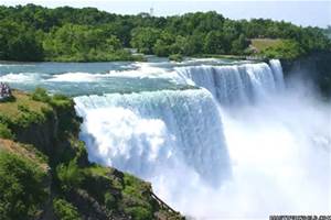 Vậy thì Hồ Michigan là một trong Năm Hồ Lớn. Năm Hồ Lớn này là kết quả của thời tan băng đâu chừng mười ngàn năm về trước, đâu chừng vào thời Lụt Lớn (tôi dịch Đại Hồng thủy đó) có tàu của Ông Tổ Noe. Băng tan ra, nước tìm cách chảy xuống chỗ thấp, gặp chỗ đất trũng thì đọng lại, thông với nhau, rồi thoát ra thành sông thành biển. Qui luật này chắc Chúa đặt ra để đất khô có chỗ cho con người ở. Nếu quả đất ngang bằng đâu cũng như nhau, đặt ống do lên mực nước nằm ngang thẳng băng thì chỗ nào trên quả đất cũng đều đầy nước, chẳng có cây cỏ mèo chó con người nào cả, loài cá cua còng cóc nhái tha hồ vùng vẫy!  Thác Nigagara |