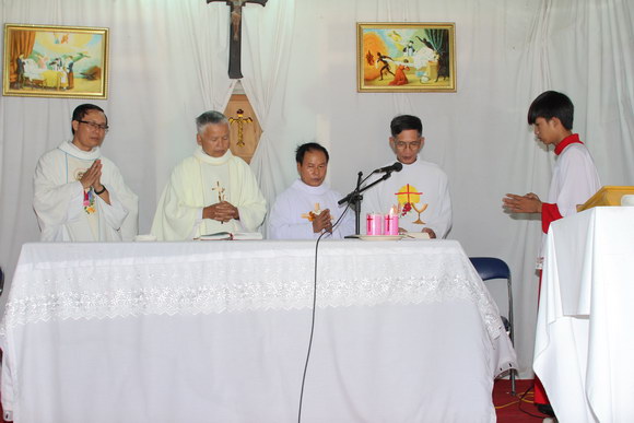 Một Thánh lễ long trọng mà xưa nay rất hiếm hoi ở ngôi làng Trung Quán này: Có 4 cha đồng tế, 3 cha ở phương Nam cùng cha Phaolô sở tại cùng hiệp dâng hy lễ toàn thiêu với cộng đoàn dân Chúa gồm giáo xứ Trung Quán, Phúc Tín, Bình Thôn và Hoành Phố và đoàn CCS Huế hơn 40 người.