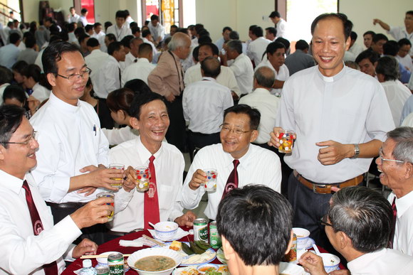 Ngoài Đức Tổng PX, chúng tôi còn may mắn gặp lại rất nhiều cha quen biết như cha nguyên bề trên Phêrô Nguyễn Hữu Giải, vị thầy nhân lành và khôn ngoan của chúng tôi trong buổi giao thời đầy khó khăn, khắc nghiệt nhất. Ơn Chúa, ngài đã tới ngưỡng 74 rồi mà vẫn trẻ trung chi lạ, tóc mới vài sợi bạc sơ sơ; cha Emmanuel Nguyễn Tấn Lục, vị đàn anh mẫu mực, trên một lớp cùng học chung sau 75, nay phục vụ tại GP Đà nẵng, nguyên cha sở Cồn Dầu. Ngoài ra chúng tôi còn gặp quý cha như cha Phêrô Phạm Ngọc Hoa, cha sở Đông Hà, cũng trên tôi một lớp; cha Dominico Minh Anh cùng lớp, nay làm cha sở Hà Úc; và các cha sau một hai lớp như cha Phaolô Nguyễn Văn Hiệu, cha sở Nam Đông; cha Antôn Nguyễn Văn Thăng, nay là quản xứ An Truyền… Đây là những linh mục nằm trong danh sách 62 người cuối cùng của TCV Hoan Thiện, cách đây tròn 36 năm.