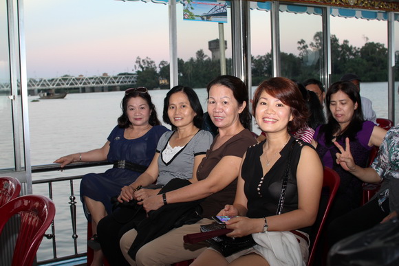 Thuyền rồng đưa chúng tôi đi dọc sông Hương, ngược lên điện Hòn Chén, đồi Vọng Cảnh…trong buổi chiều dịu nắng, bảng lãng bóng hoàng hôn đang chùng xuống thật thơ mộng và ngoạn mục… Những ca sĩ nghiệp dư trong đoàn lần lượt biểu diễn những bài hát về Huế mộng mơ rất trữ tình…
