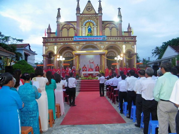 Đặc biệt năm nay, ĐTGM Giuse Nguyễn Chí Linh về Tân Mỹ chiều 17/7 ban phép Thêm Sức cho 60 em, với thánh lễ đồng tế trước sân nhà thờ. Bên kia bãi dương là Hang Đá Đức Mẹ Bãi Dương với cờ xí trang hoàng chào mừng quý khách.