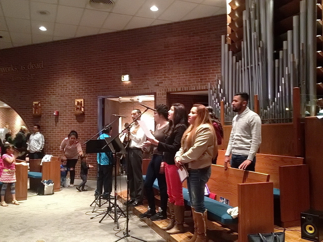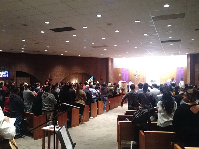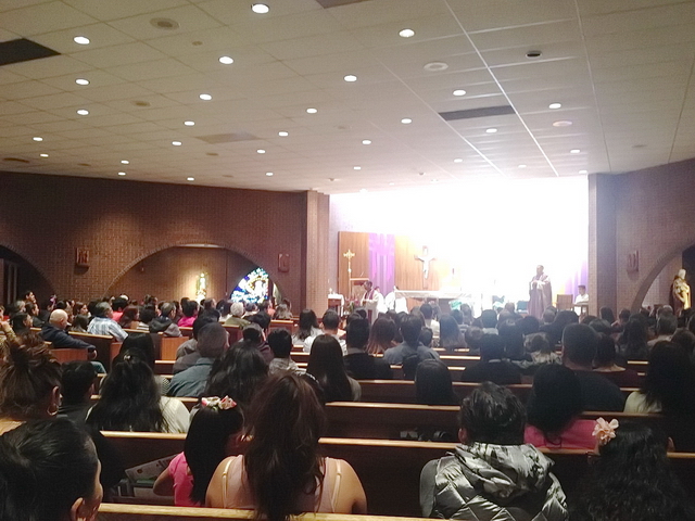 Thánh lễ 12 giờ trưa dành riêng cho người Mễ. Tôi ngạc nhiên khi nhà thờ kín hết các hàng ghế quỳ, ngoài hành lang và trong phòng trẻ con, khoảng 600 người. Họ có thể là người địa phương sinh sống ở đây lâu năm, có thể là người nhập cư trái phép, hưởng tiền trợ cấp hay không biết nói tiếng Anh.