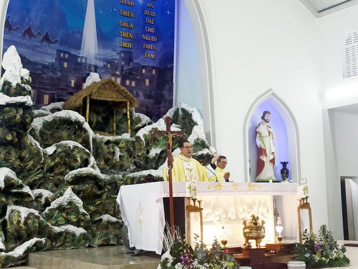 4 giờ 15 xe đến nơi. Trời tạnh ráo. Khung cảnh quanh nhà thờ còn vắng vẻ, vì vẫn còn sớm ― giờ lễ là 5:30 pm. Tuy nhiên, trong sự tĩnh lặng vẫn có bầu khí hân hoan do những dây cờ phướn tỏa xuống phấp phới từ đỉnh thánh đường và những “công trình” còn dang dở để chuẩn bị đón Lễ Giáng sinh ― cây thông Noel lớn từng phần chưa được lắp ráp, máng cỏ lộ thiên chưa trang trí và không có tượng thánh, những dây đèn xanh đỏ còn bị đứt quãng và chưa kết nối dòng điện v.v…