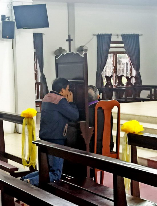 4:45 pm tất cả chúng tôi vào nhà thờ nghe cha Phêrô huấn dụ và nhận lãnh Bí tích Hòa giải. Lúc nầy, chuông nhà thờ reo vang và giáo dân đã bắt đầu qui tụ về nhà thờ chuẩn bị tham dự thánh lễ Mừng kính trọng thể Đức Mẹ Hồn Xác Lên Trời.