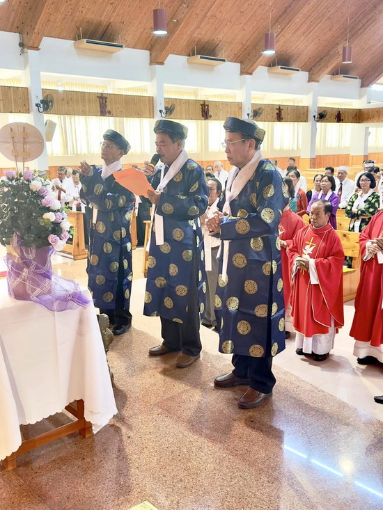 Khởi đầu Thánh lễ là phần nghi tế tưởng niệm cha Bề trên: Mỗi người đều đeo khăn tang để tỏ lòng thương tiếc cha Bề trên. Đoàn nghi tế trong trang phục truyền thống gồm có niên trưởng Lê Thiện Sĩ là bạn cùng lớp AN47 dâng hương, anh Lê Thanh Liêm HT66 là nghĩa tử rước bài vị, anh Nguyễn Ánh HT66 dâng hoa đăng và xướng văn tế. Cha linh hướng Phêrô chủ tế, cha PX. Phan Chiếm chia sẻ, quý cha Bênêđictô Nguyễn Phi Hành và Đaminh Võ Văn Thông cùng hiệp tế.