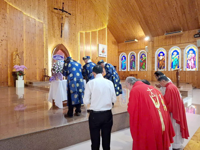 Sau đó, đoàn nghi tế và quý cha đồng tế đến trước bàn thờ phụ, cùng cộng đoàn phụng vụ cúi đầu trước di ảnh cha Bề trên. Anh Nguyễn Ánh với cung giọng bi tráng, xướng đoản văn tế kính nhớ cha Bề trên.