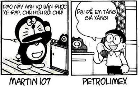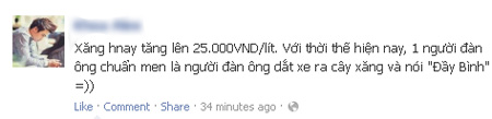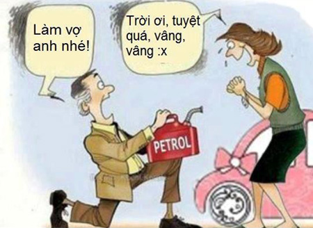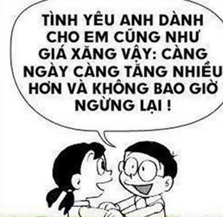 Bên cạnh đó phong trào chế ảnh cũng được hưởng ứng khá rầm rộ.  Khi giá xăng tăng kỷ lục thì món quà cầu hôn còn gì ý nghĩa hơn xăng.  Tình yêu nếu cũng luôn tăng như xăng thì tốt biết bao.  Sau vụ tăng kỷ lục này, chắc chắn doanh số bán xe đạp sẽ tăng.  Xăng tăng kéo theo sự tăng giá của một loạt các mặt hàng thiết yếu, tuy nhiên chỉ có thứ không tăng hoặc tăng mà cũng như không chính là đồng lương của mọi người.   Đại gia là người luôn hô to: "Đầy bình" khi đến cây xăng.  Và không phải ai cũng ưa.    Phóng giá xăng lên trời.  Hốt hoảng khi xăng tăng kỷ lục. |