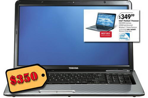 Laptop của hãng Toshiba, có màn hình cỡ lớn 17.3”, được trang bị bộ vi xử lý Intel Pentium 2.1GHz, bộ nhớ 4 GB RAM, ổ đĩa cứng 320 GB. Ngoài ra còn được tích hợp 802.11 b/g/n Wi-Fi, Webcam, và hệ điều hành Windows 7 Home Premium. Dù tốc độ vi xử lý không cao, nhưng với mức 4 GB bộ nhớ có thể bảo đảm máy chạy khá chạy trơn tru. Giá $350 có luôn license hệ điều hành và màn hình lớn quả thực khá hấp dẫn cho người dùng bình thường.