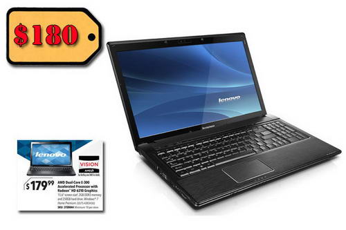 Laptop Lenovo (hãng Compaq) có màn hình 15.6”, bộ vi xử lý AMD E-300 (1.3 GHz), bộ nhớ 2GB RAM, ổ đĩa cứng 250 GB, tích hợp 802.11 b/g/n Wi-Fi, webcam và được cài sẳn hệ điều hành Windows 7 Home Premium. Cấu hình khiêm tốn thích hợp cho người có nhu cầu duyệt web, email và ứng dụng văn phòng. Tuy nhiên mức giá $180 thật hấp dẫn.