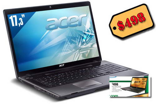 Laptop của hãng Acer (dòng Aspire) có màn hình cỡ lớn 17.3”, được trang bị bộ vi xử lý mạnh mẽ của Intel Core i5 thế hệ thứ 2 (Sandy Bridge processor), bộ nhớ 4 GB và ổ cứng 640 GB. Cấu hình này đáp ứng được mọi nhu cầu của người sử dụng có nhu cầu giải trí cao, với mức giá khá mềm ($498). Không thấy đề cập đến hệ điều hành nhưng có thể Windows 7 Home Premium được cài sẳn.