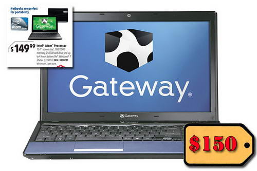 Đây là loại Netbook của hãng Gateway với màn hình 10”, cấu hình gồm bộ vi xử lý Intel ATOM 1.66 GHz, bộ nhớ 1 GB và ổ cứng 250 GB, 802.11 b/g/n Wi-Fi, webcam và được cài sẳn hệ điều hành Windows 7 Home Starter. Cấu hình này thích hợp cho việc duyệt web và dành cho người không có nhu cầu cao. Tuy nhiên mức giá $150 quả là quá rẻ (nhà cung cấp cho biết giá đã giảm đến 50%).