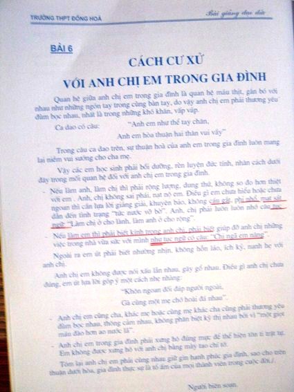 Cô con gái chị L. đang cắm cúi chép bài đạo đức bỗng nhiên gọi mẹ để hỏi: "Tiên học lễ, hậu học văn" sao lại giải thích thế này hả mẹ và đưa cho mẹ cuốn sách được trường bán và giảng dạy tại trường.