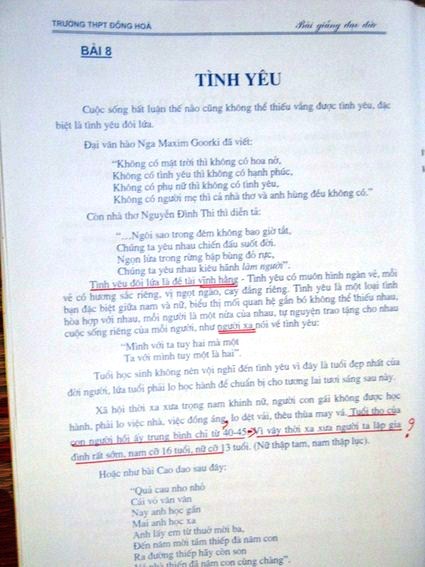 Bài "Tình yêu": "Tình yêu đôi lứa là đề tài vĩnh hằng?!" và "Xã hội thời xa xưa trọng nam khinh nữ, người con gái không được học hành, phải lo việc nhà, việc đồng áng, lo dệt vải, thêu thùa may vá. Tuổi thọ của con người hồi ấy trung bình chỉ 40-45. Vì vậy thời xa xưa người ta lập gia đình rất sớm, nam cỡ 16 tuổi, nữ cỡ 13 tuổi. (Nữ thập tam, nam thập lục)?