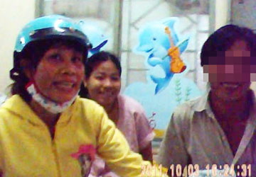 Bà Huệ (trái) và vợ chồng chị T. tại BV Hùng Vương. Ảnh: TRẦN NGỌC