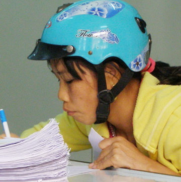 Bà Huệ đang viết tường trình. Ảnh: TRẦN NGỌC