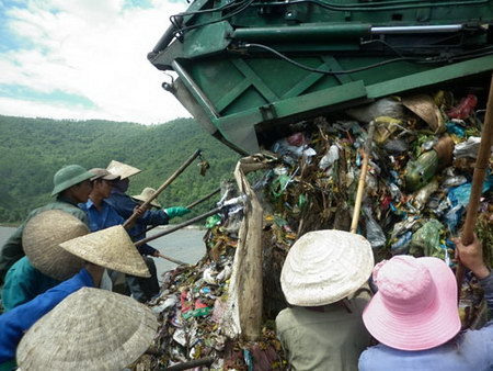 Đà Nẵng những ngày này trời nắng gắt, bãi rác Khánh Sơn giống như một công trường với hàng trăm người đang làm việc hăng say. Trong đó hầu hết là phụ nữ, khuôn mặt rám nắng, quần áo vấy bẩn, lúc nào cũng ướt đẫm mồ hôi.