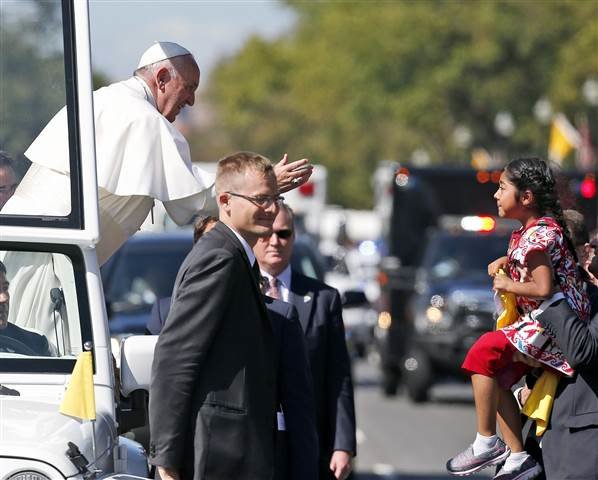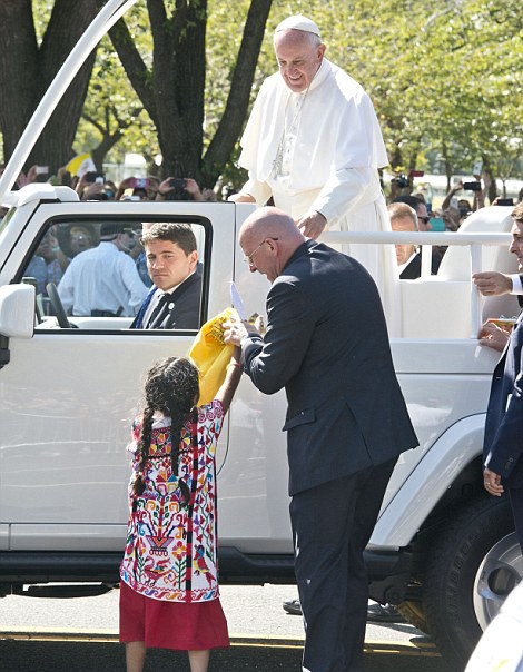 Trên hành trình được hộ tống, Giáo hoàng Francis qua khu National Mall ở trung tâm Washington, một bé gái đã băng qua hàng rào an ninh để trao cho Ngài bức thư viết tay của em.