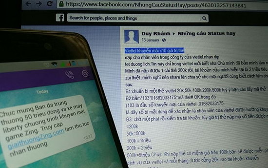 Cụ thể trên mạng xã hội Facebook lan tràn thông tin: “Theo thông tin mới lộ ra do người chú của mình làm ở Viettel cho biết thì Viettel đang có chương trình khuyến mãi đặc biệt... Kỷ niệm 10 năm thành lập, Tập đoàn Viettel khuyến mãi x10 giá trị thẻ nạp cho nhân viên trong công ty của Viettel. Tin này chỉ trong Viettel mới biết nha.