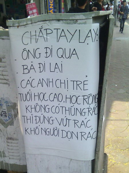 Dòng chữ van xin mọi người đừng xả rác bừa bãi được cho ở Hà Nội khiến nhiều người phải suy ngẫm. Gần đây rộ lên nhiều câu chuyện cho thấy ý thức của người Việt Nam rất kém, như thiếu kiến thức dạy con, vi phạm luật giao thông, hôi của của người nghèo, hay xả rác bừa bãi nơi công cộng.