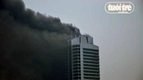 Một góc tòa tháp đôi trong khói lửa - Ảnh: Việt Dũng