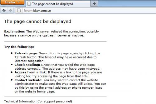 Hiện tại, theo kiểm tra của chúng tôi, tất cả các truy cập vào forum.bkav.com.vn đều không thể thực hiện và trình duyệt trả về báo lỗi "The page cannot be displayed" (không thể hiển thị trang).