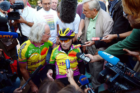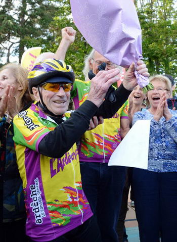 ![]() Cụ Marchand bắt đầu xuất phát. ![]() Cụ thừa nhận những km cuối cùng vô cùng vất vả. ![]() Cụ Marchand chạm đích trong sự cổ vũ của mọi người. ![]() Sau chặng đường đạp xe 100km cụ Marchand được huấn luyện viên của mình đỡ. ![]() Và được mọi người hò reo chúc mừng. ![]() Cụ Marchand và huấn luyện viên trong vòng vây của báo chí. ![]() Cụ Marchand lập kỷ lục là người 100 tuổi đạp xe nhanh nhất. |