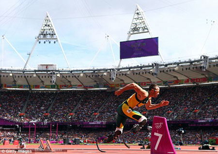 VĐV Oscar Pistorius đã khiến hàng vạn khán giả trên sân điền kinh trầm trồ với màn nước rút thần tốc để về đích thứ 2 ở vòng loại 400m nam, dù anh chạy bằng đôi chân giả.