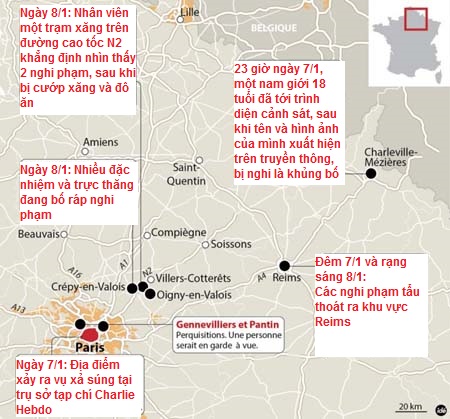 Thông tin từ báo giới Pháp cho biết, 2 nghi phạm thực hiện vụ thảm sát tại trụ sở tạp chí châm biếm Charlie Hebdo đã bị phát hiện cách Paris chừng 80 km về phía Đông Bắc. Đông đảo cảnh sát chống khủng bố, trực thăng đang tiến hành bao vây.