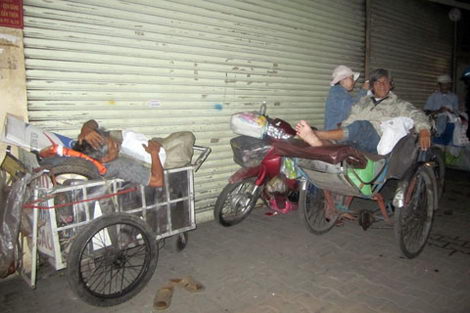 Trên vỉa hè đường Lý Thường Kiệt, nơi rất nhiều những người lao động nghèo chọn làm chỗ ngủ.