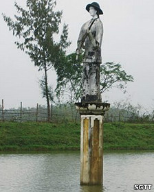 Trong hồ nước, nông dân làm chuồng nuôi vịt. Qua mấy ngày mưa lũ, đàn vịt không còn, chỉ còn lại cái chuồng xiêu vẹo tả tơi. Một bác nông dân vác cuốc đi ngang dừng lại góp chuyện: “Mấy tháng trước, hồ nước sạch sẽ lắm, không ai dám thả vịt, thả cá, nước trong vắt. Nhưng từ khi thay Phật bà bằng cô du kích thì ra như ri đây”. Phật Quan Âm? Tôi ngạc nhiên và nhìn kỹ thì thấy có điều lạ là cô du kích này đứng trên... toà sen.