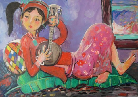 Búc tranh "Chơi đàn" (Playing guitar) với hình ảnh rất Việt Nam