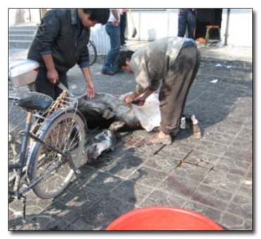 Đây là món ăn có nguồn gốc từ Trung Quốc với cái tên Huo Jia Lu (có nghĩa là Lừa sống). Có thể nói đây là món ăn có cách thức chế biến đơn giản nhất trong số những món kể trên đầu tiên trói chân con vật còn sống và cắt từng miếng thịt của con vật còn sống để ăn mặc cho nó la vì đau đớn.