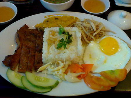 Cơm tấm là món ăn đặc trưng ở Sài Gòn, ăn kèm với trứng ốp, sườn rán và một loại