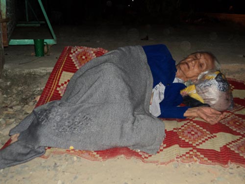 Ai thương tình thì cho bà chén cơm, miếng bánh. Có hôm được người ta cho ăn uống nhưng cũng có hôm bà nằm co chịu đói. Tối đến, bà cụ nằm co ro ven đường, trên một chiếc chiếu nhỏ, bên cạnh có vài bộ quần áo vo tròn. Những hôm trời quang mây tạnh còn đỡ chứ hôm nào trời mưa thì bà không biết trú ở đâu.