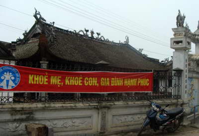 Khẩu hiệu tuyên truyền dân số và gia đình mới được căng lên ở đình Vân Côn.
