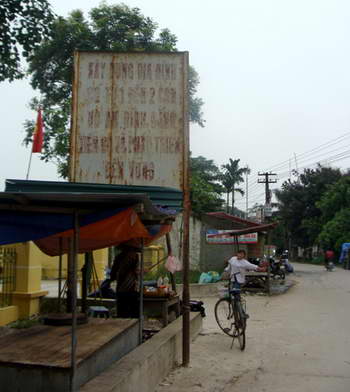 Tấm biển tuyên truyền dân số dãi dầu mưa nắng ở giữa làng Vân Côn.