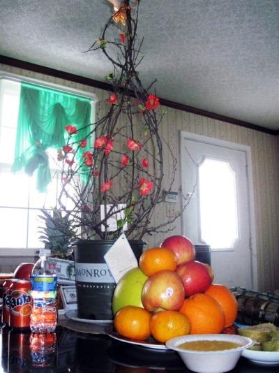Để mua hoa trưng bày đón Tết, chúng tôi phải đến một khu chợ khác. Shop hoa lèo tèo dăm chậu quất mà phần lớn là… lá và trái xanh lè nhiều hơn trái chín vàng. Dăm chậu hoa tên gì mà tôi không biết, cành khẳng khiu, vươn dài, lá nhỏ, hoa có màu như hoa đào, cành có gai nhỏ. Tôi chọn một chậu vừa búp vừa hoa chừng hơn 20 cái, có giá thân thiện, vì đã được ông chủ người Việt bớt còn lại 40 Dollar.