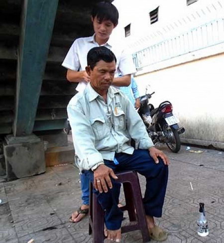Mỗi chiều, dưới chân cầu thang Bệnh viện Ung bướu đường Nơ Trang Long, phường 7, quận Bình Thạnh, Sài Gòn, một chàng trai vừa lẹ làng vừa tỉ mỉ hớt tóc cho hàng chục bệnh nhân và những trẻ em nghèo sống lang thang.