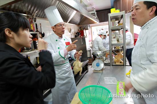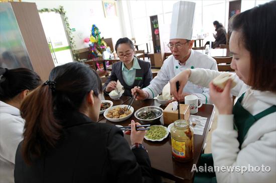 ![]() Các nhân viên phục vụ đang tập mỉm cười và ngôn ngữ bằng tay tại nhà hàng "không tiếng nói" ở thành phố Yên Đài, tỉnh Sơn Đông, phía đông Trung Quốc hôm 28/2. Nhà hàng được một người gây quỹ từ thiện có tên là Yu Chaohua mở ra với thông điệp "hãy dành cho nhau nhiều tình yêu thương". Trong số 11 nhân viên của nhà hàng có tới 8 người bị khiếm thính. Ba người khác là thông dịch viên để giúp các nhân viên giao tiếp với khách hàng dễ dàng hơn. Fan Hongzhen và chồng mỉm cười hạnh phúc khi phóng viên yêu cầu chụp một bức ảnh làm kỉ niệm. Cả hai người đều bị khiếm thính và hiện cùng làm việc tại nhà hàng này. Những hình ngón tay thể hiện cho ngôn ngữ của người câm điếc được đặt trong nhà hàng và có tác dụng như vật trang trí. Khách hàng đến ăn, nếu muốn chọn món thì có thể đánh dấu vào thực đơn để yêu cầu nhà hàng phục vụ. Li Chang, một đầu bếp nổi tiếng người Hong Kong, đang truyền những bí quyết nấu ăn ngon cho các nhân viên khác của nhà hàng hôm 28/2 với sự hỗ trợ của một nữ phiên dịch viên. Bữa trưa của nhân viên nhà hàng vẫn ngon miệng và vui vẻ dù không mấy ai lên tiếng. |