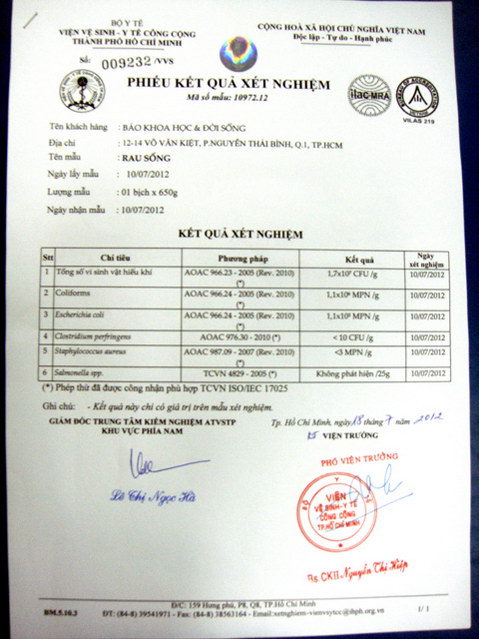 Kết quả rất bất ngờ với tổng số vi sinh vật hiếu khí trong rau xét nghiệm cao gấp 1.700 lần, coliforms (phân) cao gấp 110.000 lần, escherichia coli cao gấp 433 lần... Đây chỉ là xét nghiệm về vi sinh, chưa nói đến ký sinh trùng, vì hiện nay ở Viện Vệ sinh - Y tế công cộng TPHCM và một số labo khác chưa làm xét nghiệm ký sinh trùng.