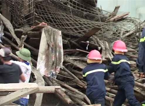 Khi nhóm công nhân đang đổ bê tông mái sảnh của một khách sạn ở thành phố Hà Tĩnh, bỗng khối bê tông sụp xuống, vùi chết một người và làm bị thương 7 người khác.