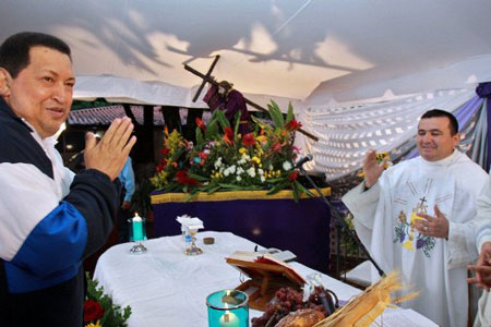 Tổng thống Chavez dưng dưng trong buổi lễ thánh ở quê nhà.